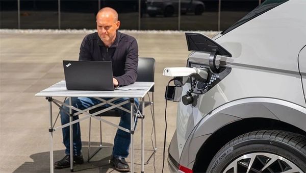 Xe điện đang sạc cho laptop. Ảnh: CarsGuide