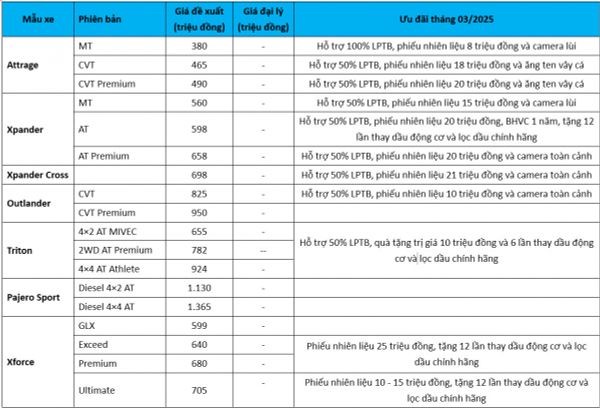 Dưới đây là bảng giá chi tiết ô tô Mitsubishi tháng 3/2025: