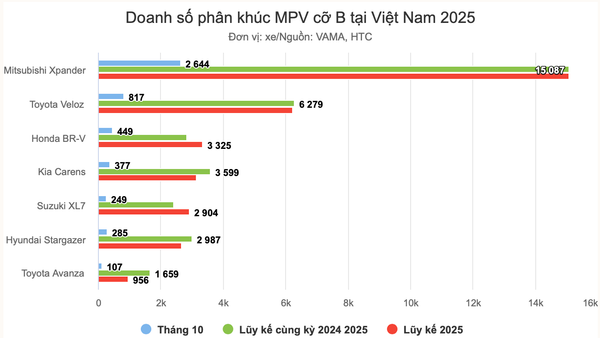 Trong nhịp tăng trưởng chung của thị trường, doanh số hầu hết các mẫu MPV cỡ B tháng 10 đều cải thiện so với tháng trước. Mitsubishi Xpander vẫn áp đảo các đối thủ khi doanh số đạt 2.644 xe, chiếm hơn một nửa tổng lượng bán ra của toàn phân khúc.