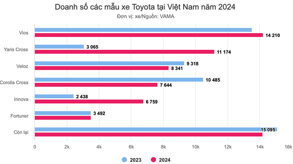Mức tăng trưởng tốt của Toyota trong năm 2024 nhờ vào ba cái tên là Vios, Yaris Cross và Innova (cả bản mới và cũ), trong khi đó các sản phẩm còn lại đi ngang hoặc giảm. Ngoài ra, Toyota cũng là hãng đầu tiên công bố doanh số hàng tháng, nhờ phát triển hệ thống quản lý bán hàng và dịch vụ mới (TMSS) để có thể cập nhật số bán hàng ngày, chốt số lượng bán hàng tháng trước vào ngày đầu tiên của tháng sau. Sự thay đổi về doanh số các mẫu xe trong 2024 như dưới đây: