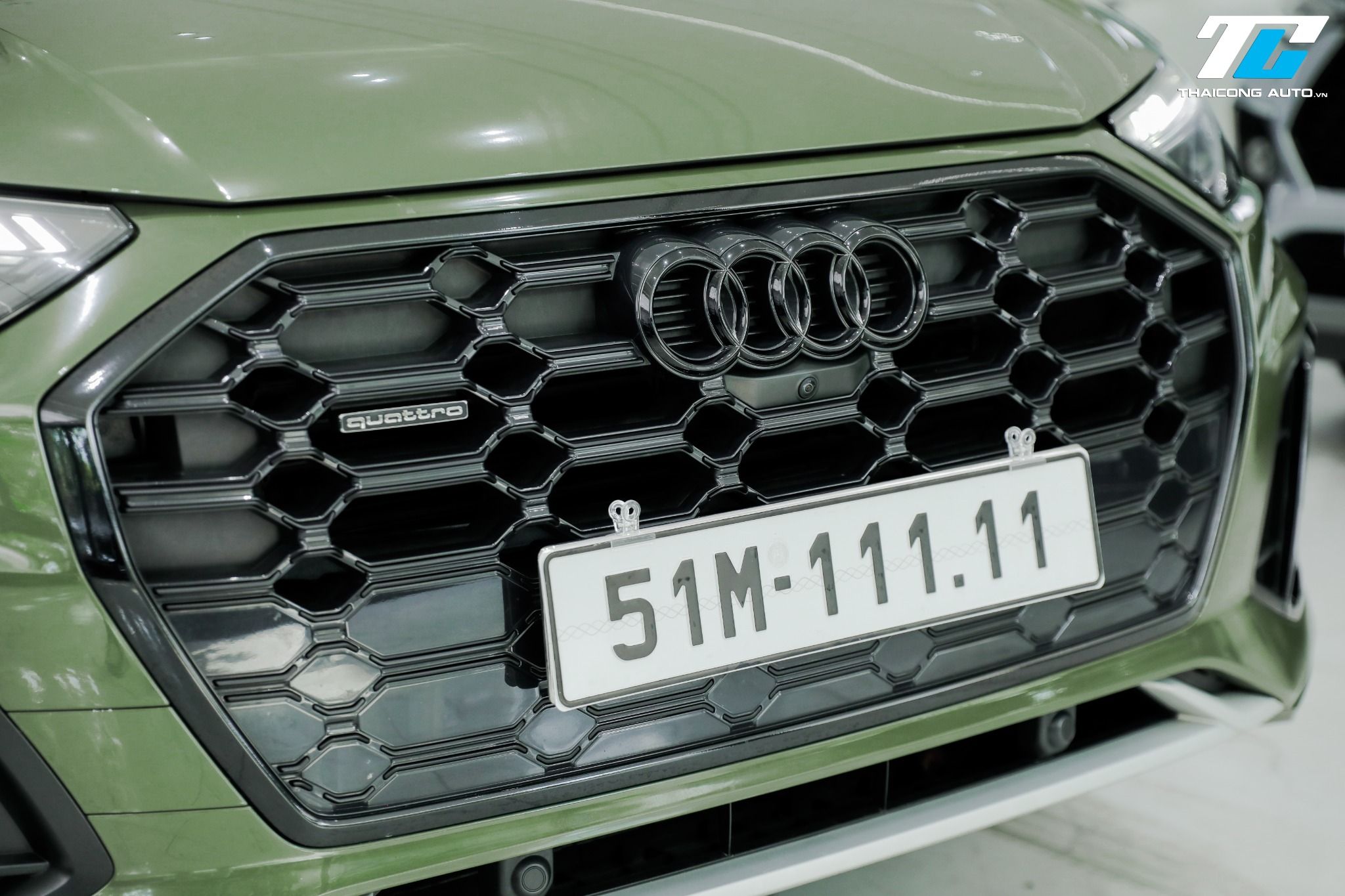 Phần đầu xe nổi bật với lưới tản nhiệt khung đơn hình lục giác, sơn đen bóng hoặc mạ chrome kết hợp cùng logo ở trung tâm. Cụm đèn pha LED Matrix sắc sảo, tích hợp dải đèn LED định vị ban ngày với đồ họa độc đáo, mang lại khả năng chiếu sáng vượt trội và vẻ ngoài cuốn hút. Cản trước thể thao S-line với các hốc hút gió lớn, tạo vẻ hầm hố và năng động.