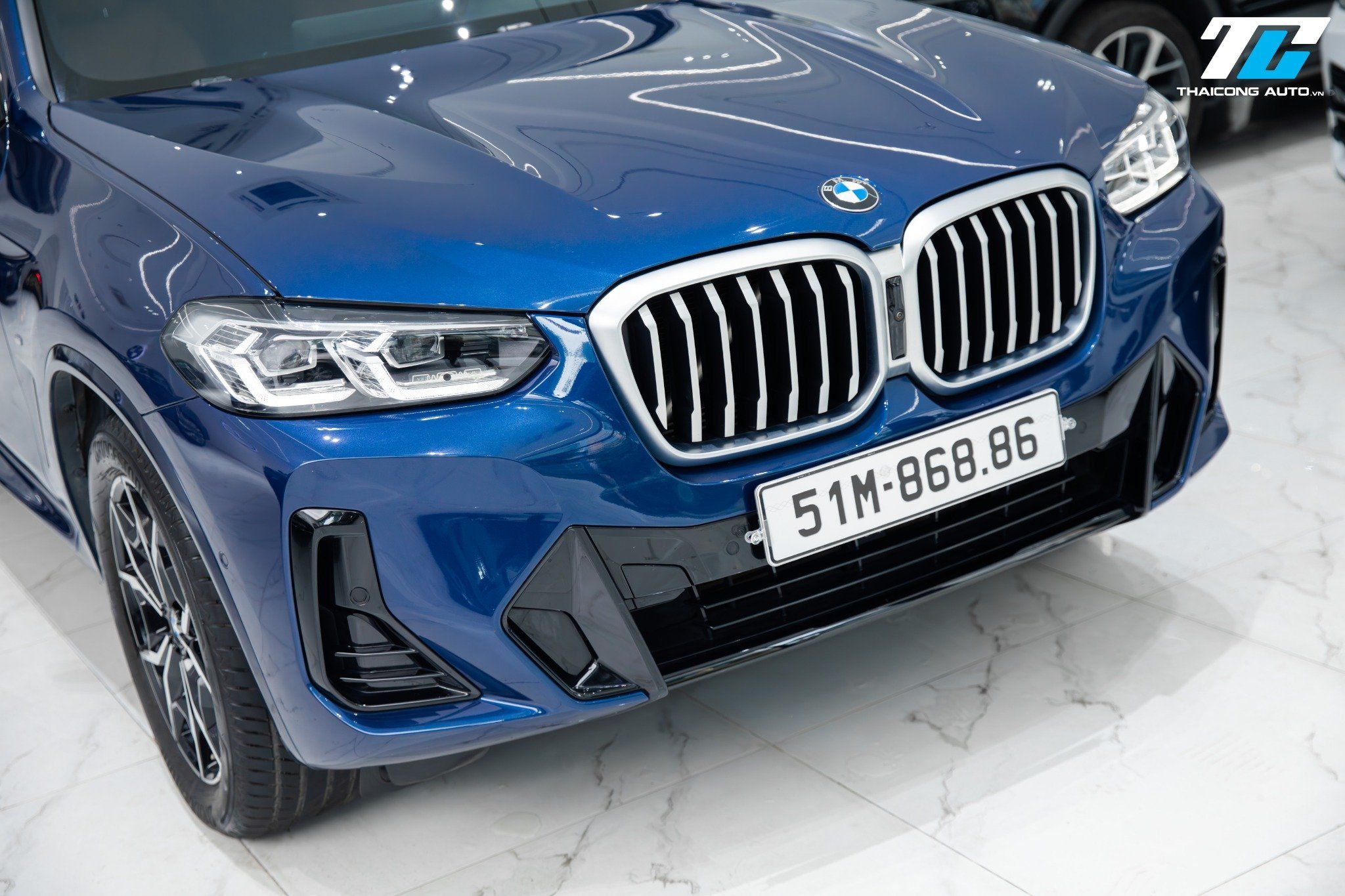 Phần đầu xe nổi bật với lưới tản nhiệt hình quả thận kích thước lớn, sơn đen bóng, tạo vẻ hầm hố và nhận diện thương hiệu rõ nét. Cụm đèn pha LED thích ứng (Adaptive LED Headlights) sắc sảo, tích hợp dải đèn LED ban ngày cá tính, mang lại khả năng chiếu sáng vượt trội. Cản trước M Sport với các hốc hút gió lớn, nhấn mạnh vẻ thể thao của chiếc xe.