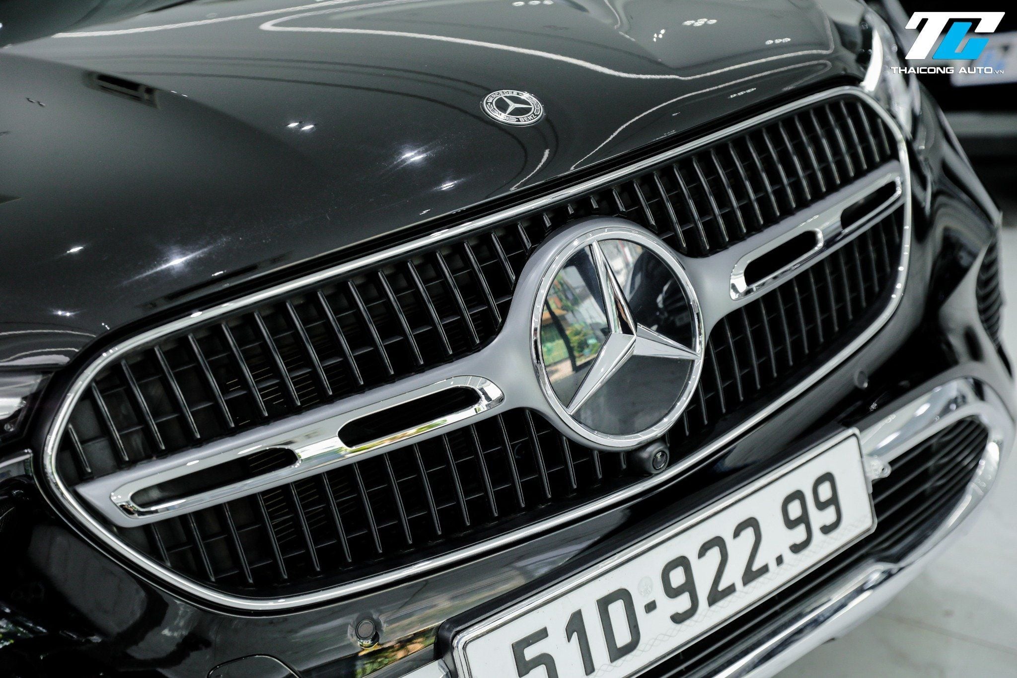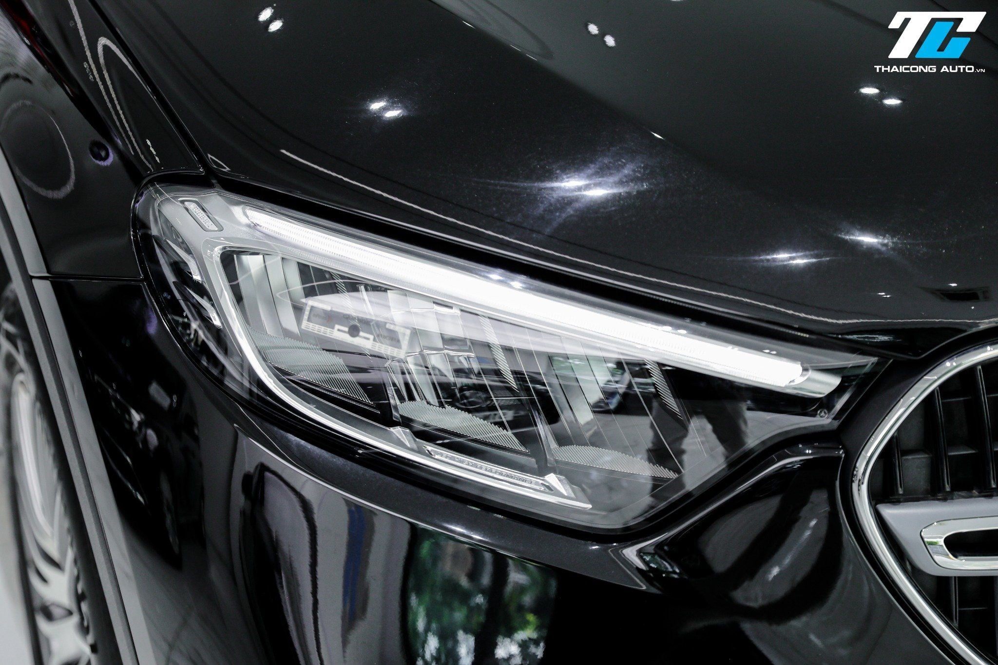 Chiếc xe sở hữu một hình dáng tổng thể cân đối, với phần đầu xe uy lực, thân xe mềm mại và đuôi xe hiện đại, tạo nên một tổng thể hài hòa và sang trọng. Mặt ca-lăng với họa tiết ngôi sao ba cánh đặc trưng, kết hợp logo Mercedes-Benz ở trung tâm, tạo vẻ uy lực và nhận diện thương hiệu rõ nét. Cụm đèn pha Full-LED High Performance sắc sảo, tích hợp dải đèn LED định vị ban ngày tinh tế.