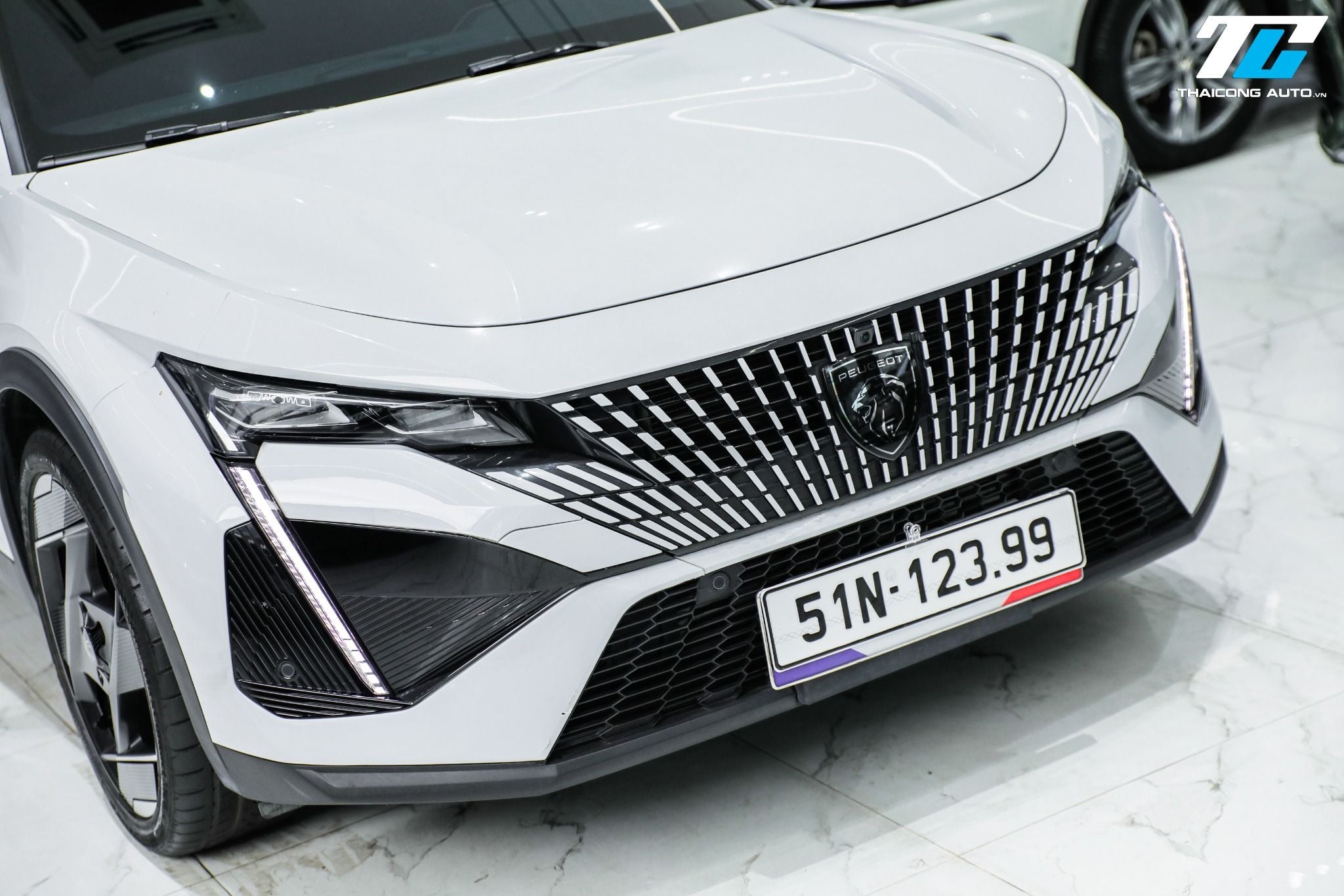 Mặt ca-lăng tràn viền với họa tiết 3D cùng màu thân xe, kết hợp logo Peugeot mới, tạo cảm giác liền mạch và mạnh mẽ. Hệ thống đèn pha Matrix LED hiện đại bậc nhất, tích hợp dải đèn định vị ban ngày dạng nanh sư tử, mang lại khả năng chiếu sáng vượt trội và nhận diện thương hiệu đặc trưng.